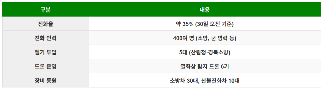 🔥 드론을 활용한 열화상 감지로 잔불 위치를 파악하고 있으며, 헬기 투하와 방화선 구축이 동시에 진행 중입니다.