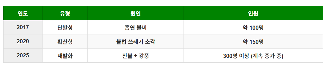 이번 산불은 단순한 부주의가 아닌, 불씨의 생존력과 기후 조건의 악화가 결합된 재난입니다.