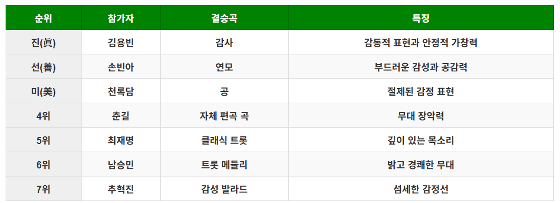 - 특징: 감성적인 표현력과 완벽한 가창력으로 심사위원과 시청자를 모두 사로잡음