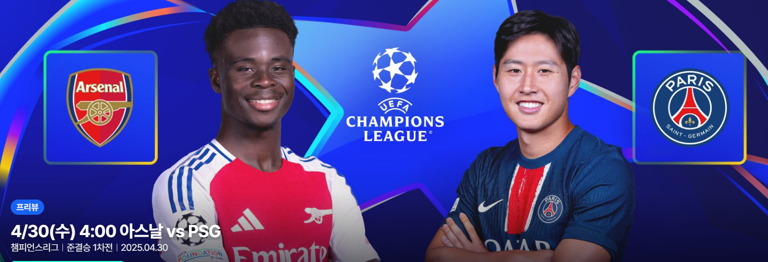 - 아스널 vs PSG: 1차전 4월 30일 04시 (런던), 2차전 5월 8일 04시 (파리)