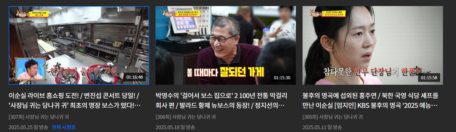 2025년 5월 25일 방송된 KBS2 예능 <사장님 귀는 당나귀 귀> 307회에서는 새로운 보스 안유성 셰프가 출연하였습니다.