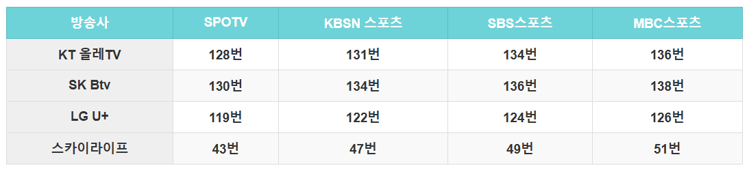 중계를 보려면 내 셋톱박스에서 몇 번 채널인지도 중요하죠. IPTV별 주요 채널 번호는 아래와 같습니다.