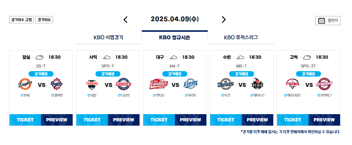 - 오늘 일자 경기 별 정보에서 선발투수 확인 가능