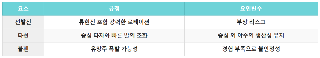 이런 선발진은 KBO 리그에서도 최상위 수준의 구성을 자랑하며, 부상 변수만 없다면 압도적인 이닝 소화가 가능할 것으로 기대됩니다.