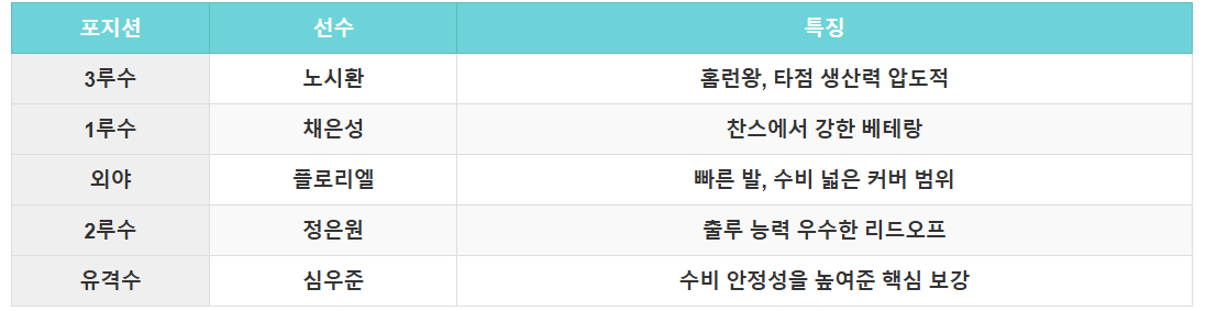 공격과 수비 모두 정은원-노시환-채은성 라인이 중심을 잡고 있으며, 문현빈과 플로리엘 등 빠른 발을 가진 선수들이 주루에서 활력을 불어넣고 있습니다.