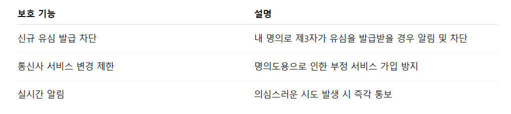 PASS 앱에서 제공하는 '명의도용 방지 서비스'는 다음과 같은 보호 기능을 제공합니다: